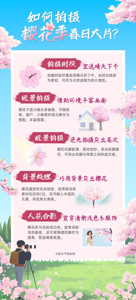 櫻花盛放燦若云霞,但花季卻十分短暫,拍照是留住櫻花之美的絕佳方法之一。如何捕捉櫻花的層次感?人花合影如何營造浪漫氛圍感?中國天氣網(wǎng)從景別、構圖、拍攝時段等方面總結了拍攝小貼士,助你拍出絕美春日大片。
