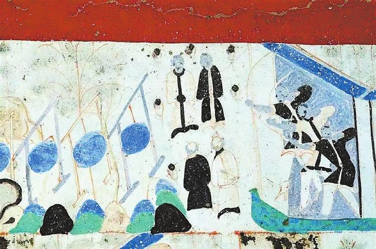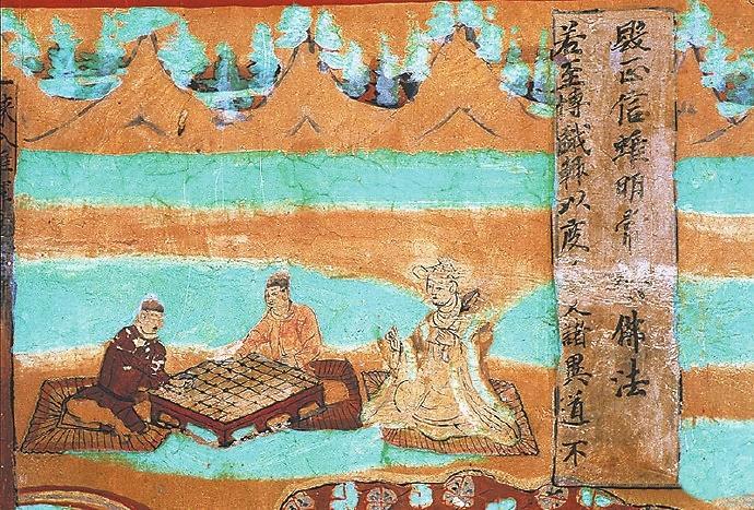 在敦煌壁畫中有關(guān)對弈的內(nèi)容較多。在莫高窟第454窟、第7窟壁畫中都有“弈棋圖”。兩幅圖的畫面有不少類似的地方:一是畫師較為突出棋盤的位置,兩幅壁畫中的棋盤都居中且形制相對巨大;二是畫面上的人物均為三人,兩人對弈,一人觀戰(zhàn),“觀棋不語真君子”;三是對弈者身后的景色都是天朗氣清、遠山含黛。據(jù)說,一天,北宋大文豪蘇東坡與摯友黃庭堅正在松樹底下弈棋。一陣風(fēng)吹來,松果掉進棋盤。蘇東坡隨即吟道:“松下圍棋,松子每隨棋子落。”黃庭堅馬上回答道:“柳邊垂釣,柳絲常伴釣絲懸。”雅趣十足。其實,棋局里的一動一靜、一招一式無不需要謹小慎微、穩(wěn)扎穩(wěn)打。而對弈時的當(dāng)斷則斷、示假隱真、有效合作等戰(zhàn)術(shù)不僅是對弈的智慧,也是人生的哲理吧。