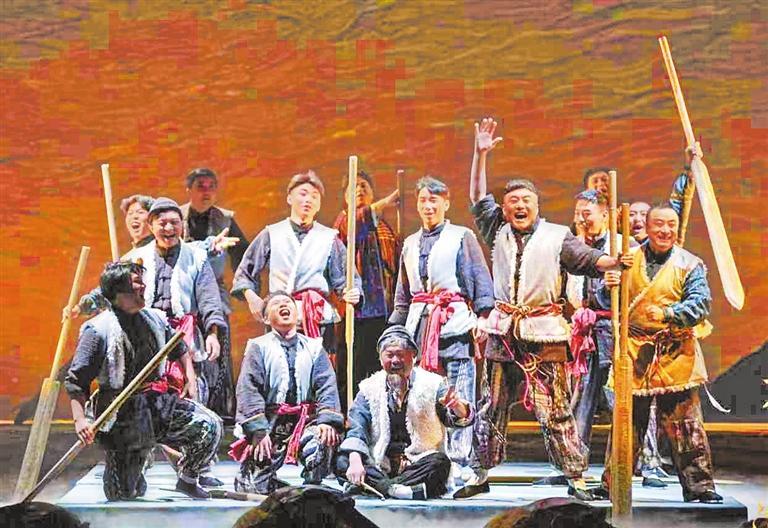 作為甘肅省隴劇院推出的“黃河三部曲”系列的第二部,《大河?xùn)|流》不僅承擔(dān)著隴劇藝術(shù)傳承的使命,更肩負(fù)著講好黃河故事的文化責(zé)任。通過對抗戰(zhàn)歷史的挖掘與呈現(xiàn),該劇將西北后方的抗戰(zhàn)貢獻納入敘事體系,使黃河文化成為連接歷史與現(xiàn)實的精神紐帶。正如劇中朱槐花的唱詞所言:“繼兒遺志遂兒愿,誓將木筏化戰(zhàn)船。擎起劍槳過險灘,乘風(fēng)破浪勇向前”,這種將個人命運與民族命運緊密相連的敘事策略,使作品在當(dāng)代語境下彰顯了強烈的現(xiàn)實意義。