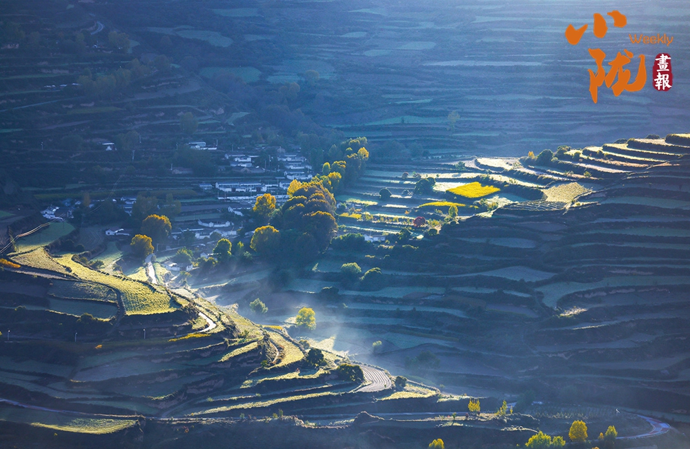 秋末初冬,多彩秋色映照著美麗的臨潭。五彩斑斕的梯田縱橫交錯、順山而變,宛如一條條彩帶,在山間飛舞。村落點綴其間、古樸自然,田園生活詩意盎然。