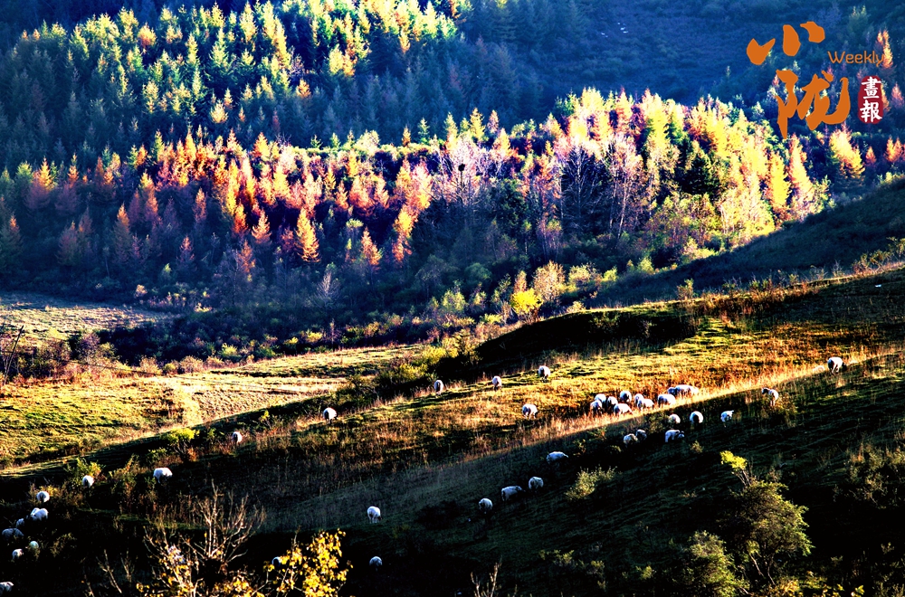 山川被染成一片耀眼的金黃,宛如大地披上了柔軟的絨毯。一群群牛羊散落其中,如同大地寫下的詩句,一行行、一段段,在彩色的大地上書寫著屬于自然的韻律。