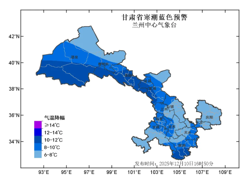 蘭州中心氣象臺(tái)2025年12月10日16時(shí)50分發(fā)布寒潮藍(lán)色預(yù)警:預(yù)計(jì)11日至13日清晨,全省大部自西向東最低氣溫下降6-8℃,其中河西五市、隴南等部分地方及隴中局部地方下降8~10℃,局地可達(dá)10℃以上,上述部分地方將出現(xiàn)寒潮。河西五市降溫時(shí)段為11日白天至12日白天,省內(nèi)其余地方降溫時(shí)段為11日夜間至13日清晨。請(qǐng)注意防范!
