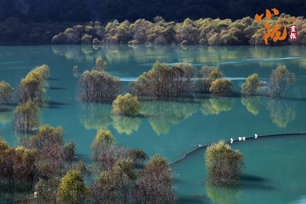 白龍江湍急的流速在此悄然蛻變?yōu)橐粸硿赝竦谋滩?,水面澄澈如鏡,映照出如江南般清淺而纏綿的景致。